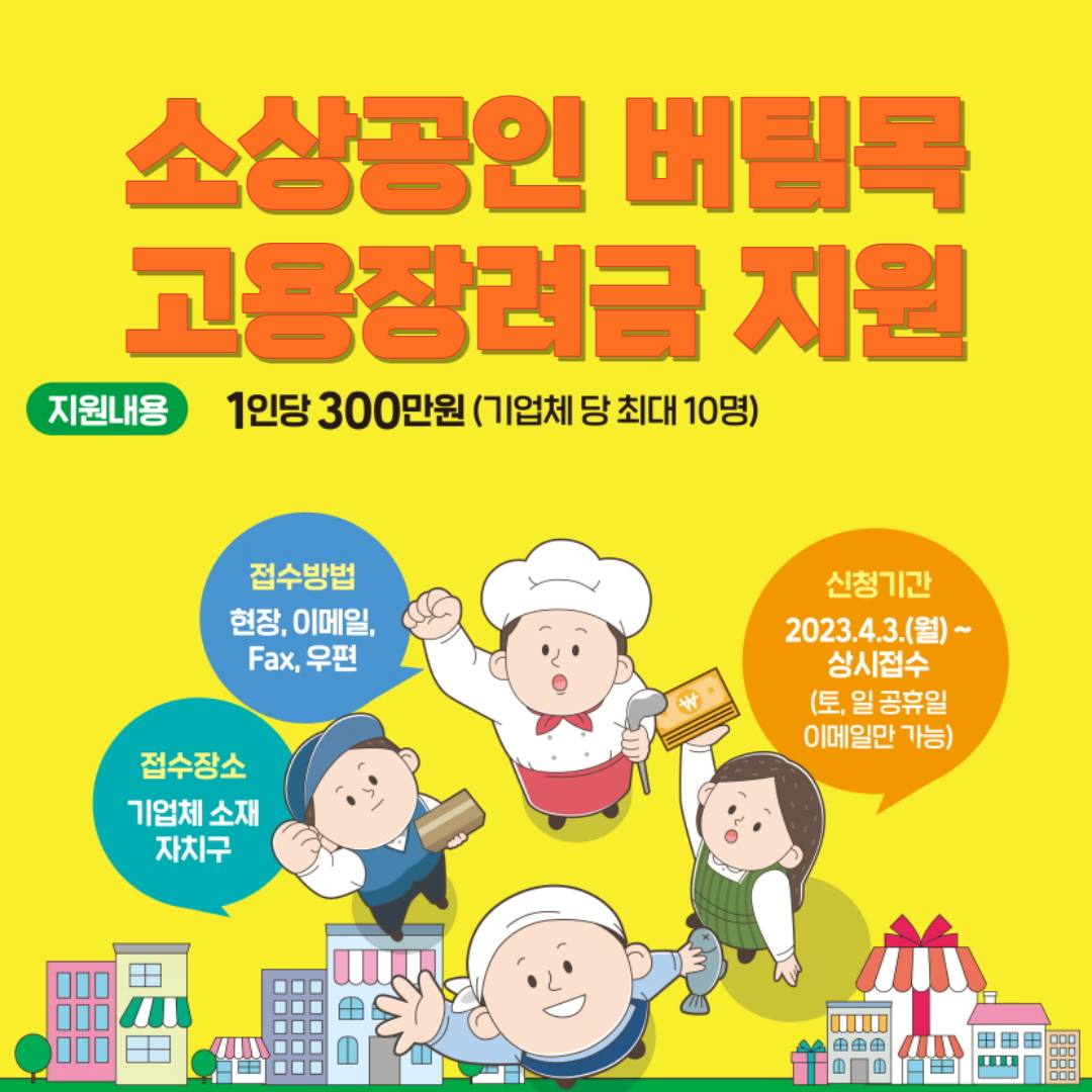 서울시에서 소상공인 기업체에 1인당 고용장려금 300만원을 지원하고 있는 소상공인 버팀목 고용장려금 지원사업을 검토했습니다. 민생경제 회복과 소상공인 기업체에 많은 도움이 되겠습니다. 자금이 소진되기 전에 서둘러 신청하는 것을 권해드립니다.