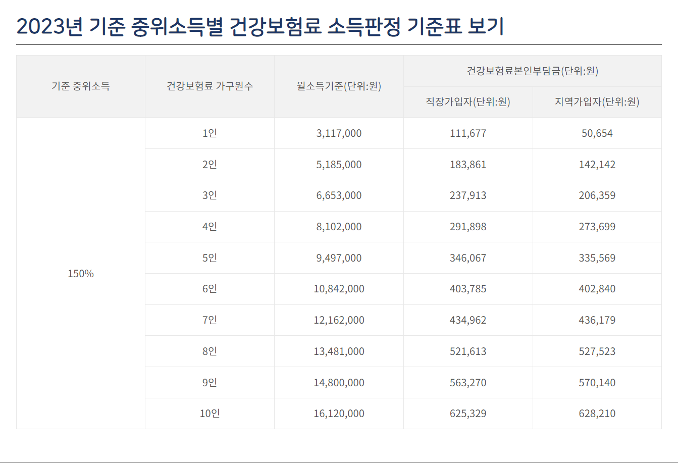 - 신청인이 속한 가구의 건강보험료 고지금액(2023년 4월분)이 2023년 건강보험료 소득판정기준표상 기준 중위소득 150%의 건강보험료 본인부담금이하여야 한다. (아래 소득판정 기준표에서 확인하세요)