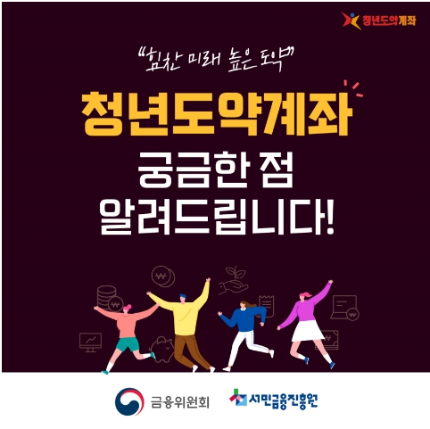 청년도약계좌 중장기 자산형성 지원을 위한 정책형 금융상품입니다. 만기 5년 기간 매월 70만 원 한도 내에서 신청자가 자유롭게 납입하면 정부에 매월 최대 6%의 정부기여금을 지급합니다. 또한